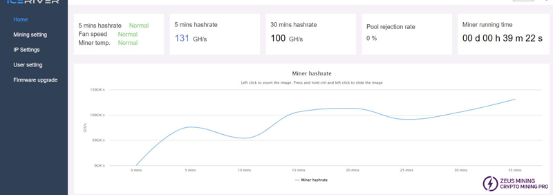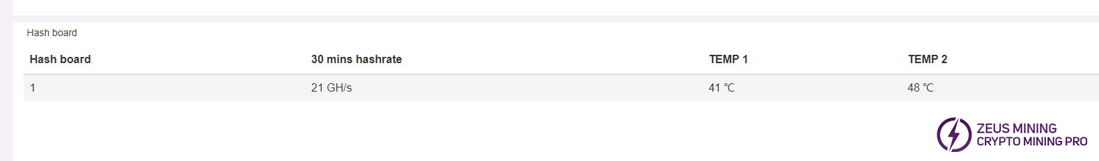 Enter the backend to check whether the miner's hash rate reaches 100G after 30 minutes of operation and whether the Fan speed and the Miner temperature are displayed as Normal.