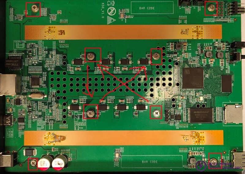 Step 3: Install M2.5*9.5 spring screws and attach black insulating gaskets. There are 8 screws in total. Note that the order of screwing must follow the arrows in the figure, first inside, then outside. Adjust the torque of the electric screwdriver to 6 and drive perpendicular to the PCBA.