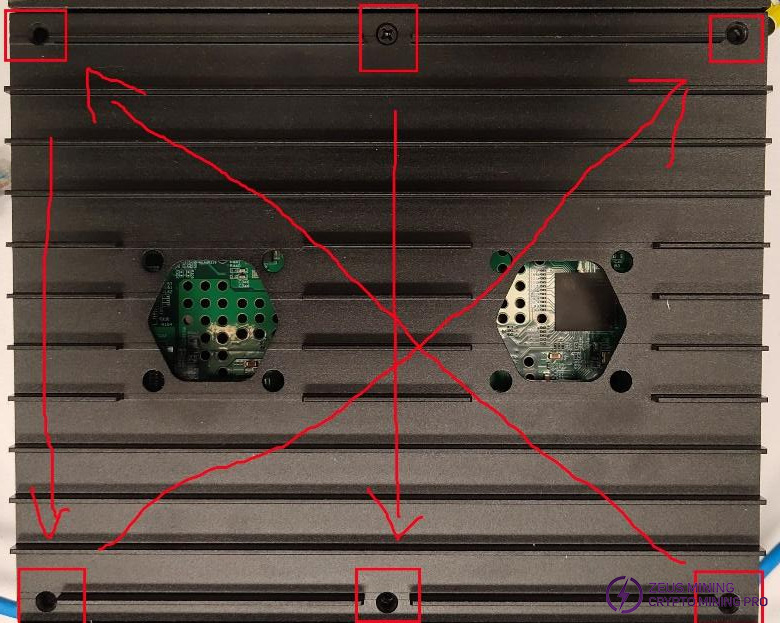 Step 5: Plug in the fan and install the backboard. Use M3*8, cross thin countersunk. There are 6 screws in total. Note that the order of screwing must follow the order indicated by the arrows in the figure, first inside, then outside, and then in the middle. Adjust the torque of the electric screwdriver to 6.