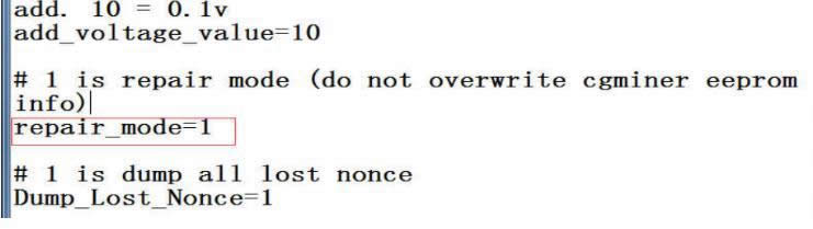3. After sales, the miner in the condition of the software without sweeping frequency needs to change the repair mode under the fixture config file to 1, that is, the eeprom data is not cleared when testing;