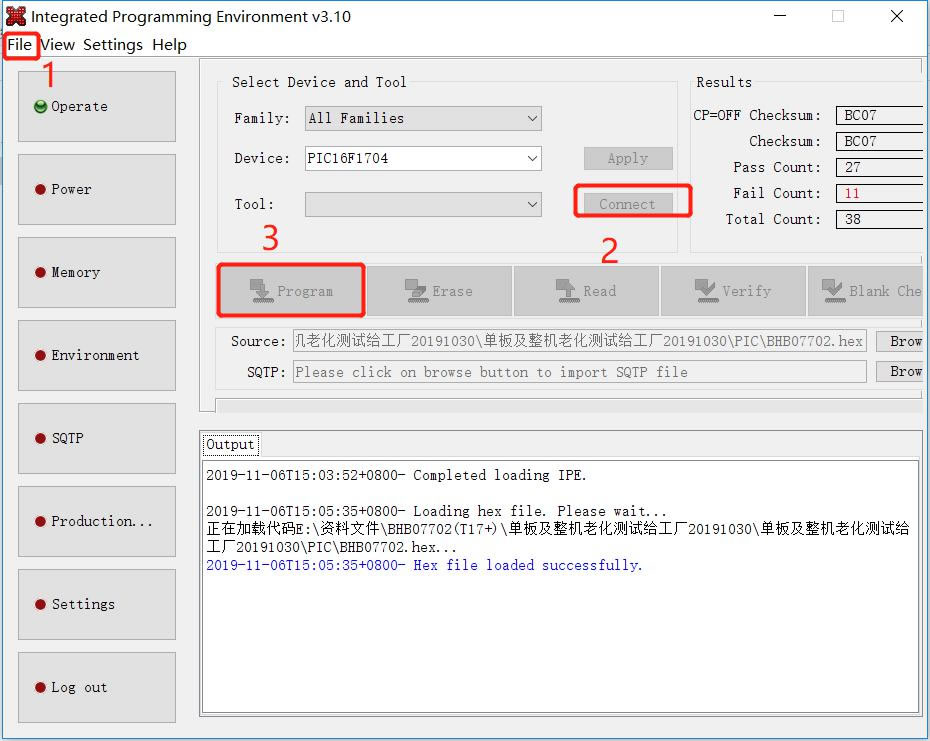 Open MPLAB IPE, select device: PIC16F1704, click power to select the power supply method, and then click operate. First step: select the file to find the .HEX file to be programmed. Second step: click connect to connect normally. Third step: click the program button, then click verify after finish. Prompt will be sent to prove that the programming is successful.