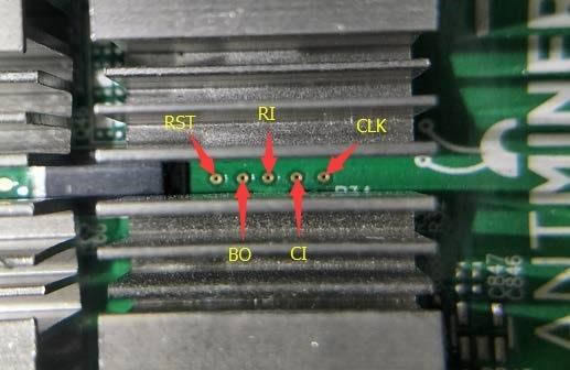 4. Missing chips: Missing chips means that when conducting hash board tester checks, all 18 chips (three chains display respectively) cannot be found, but only some of them. The actually missing (cannot find by checking) anomaly chips are not in the shown location. You need to pinpoint the anomaly chip by testing. The pinpointing can be conducted by intercepting TX. Pivot the TX signal of a certain chip over the land, such as, after setting the TX output of chip No. 14, over the earth and all previous chips are normal, the hash board tester should show 50 chips. If not, the anomaly exists before No. 14; if it does, the anomaly chip is after No. 14. Repeat this until you locate the anomaly chip bydichotomy.