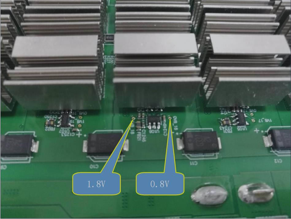1. Regular Check: observe the target board to find cooling fin displacement, deformation or burn? Such issues take priority, displacement can be solved by taking it off, wash off the glue and re-glue it after the maintenance. If there is no problem, then check impedance of each and every voltage domain to see if there is short/open circuit, which then takes priority. Check if every domain reaches 0.45V and voltage different no greater than 0.05. Voltage too high or too low suggests anomalies in the neighboring domains.