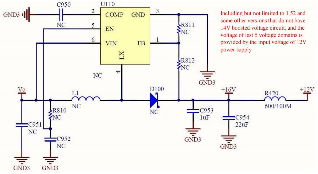 The responsibility is to boost DC-DC (8.3 - 9.2V) to 14V, and the principle is to boost 9V to 14V through U110 RT8537 switching power supply, the switching signal produced by U110 stores energy via L1 inductance, and then D100 boosted rectifying diode charges and discharges C954, and thereby get the 14V of C954 positive electrode.