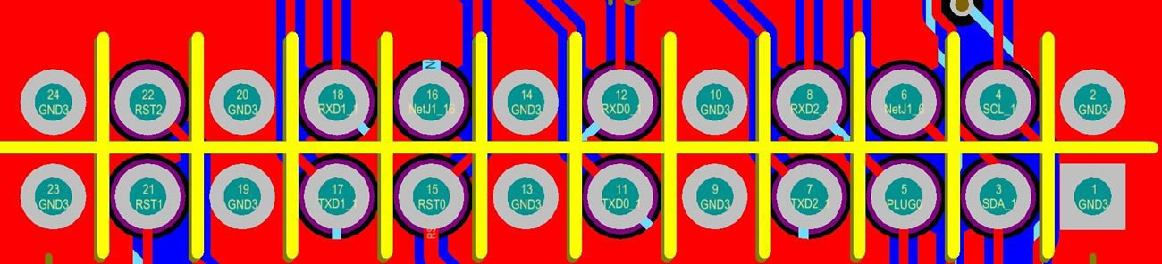 Red line is RST signal flow, IO mouth pin 15(RST0)/21(RST1)/22(RST2) in, transmits from No. 1 chip to No, 18 chip; 0V when IO signaling wire is not plugged or in standby, and 1.8V in computing. Resistance is 440.