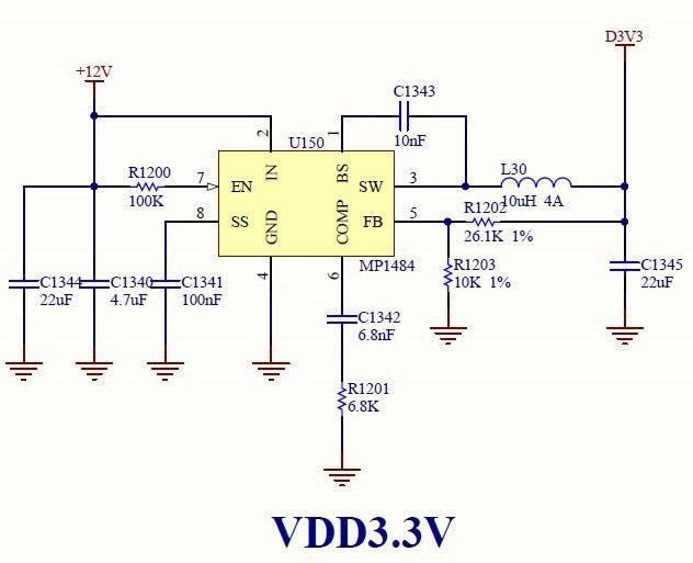 Responsible for reducing voltage to 3.3V from 12V, and the principle is to reduce 12V to 3.3V through U115 MP1484 switching power supply, the switching signal produced by U150 stores energy via L30 inductance, charges and discharges C1345, gives sampling feedbacks via R1202/R1203 to U150 and thereby controls the voltage of C1345 positive electrode. See Fig 14 and Fig 15: