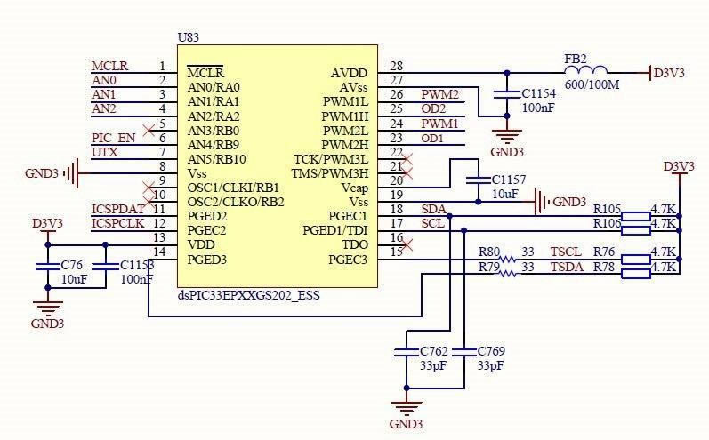 When PIC works, it needs to control and send a heartbeat signal every 10 seconds or so. Without heartbeat information, PIC will be closed after 10 seconds. PIC pin 13 is VDD 3.3V, pin 8 is GND, pin 11 and 12 are I²C bus wire that connects IO mouth to control panel, pin 2, 3 and 4 are PIC addresses; pin 4 is PIC 3.3V; pin 24 and 26 are the PWM output of PIC, pin 23 and 25 are the OD output of PIC, and control DC-DC voltage; pin 6 is EN signal that PIC outputs, and controls DC-DC operational status.