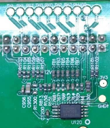 Yellow line is RX (RI, RO) signal flow, returns from No. 18 chip to No. 1 chip, and then returns to control panel from IO mouth pin 8(RX2)/12(RX0)/18(RX1); the voltage is 1.8V when IO signaling wire is not plugged, and the voltage is also 1.8V in opearation. Resistance is 580.
