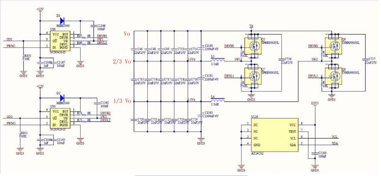 MAX15026 voltage regulator produces PWM switching signal to drive the two pairs of MOS tubes (Q1/Q3, Q4/Q5) of upper and lower bridges, and stores energy via L2 inductance, NCP3420D, driven by PIC, produces PWM switching signal to drive the two pairs of MOS tubes (Q2/Q7, Q6/Q8) of upper and lower bridges, and then filters via C19 and C20 after connection.