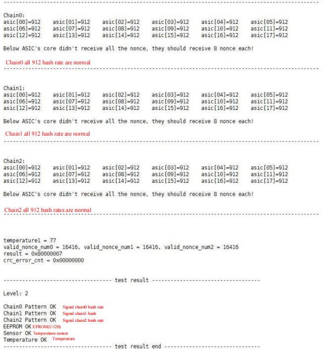 3) Determine the operation status of Hash board, hash rate of chip, temperature sensing, etc. according to print window information of test tool.