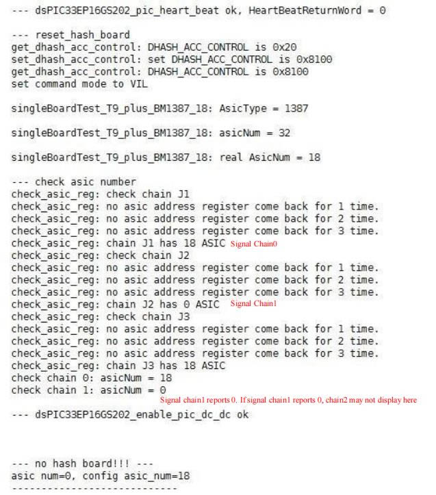 No running means the hashboard tester cannot detect the chip information of the Hash board and shows “No hash board”; this is the most frequent problem.
