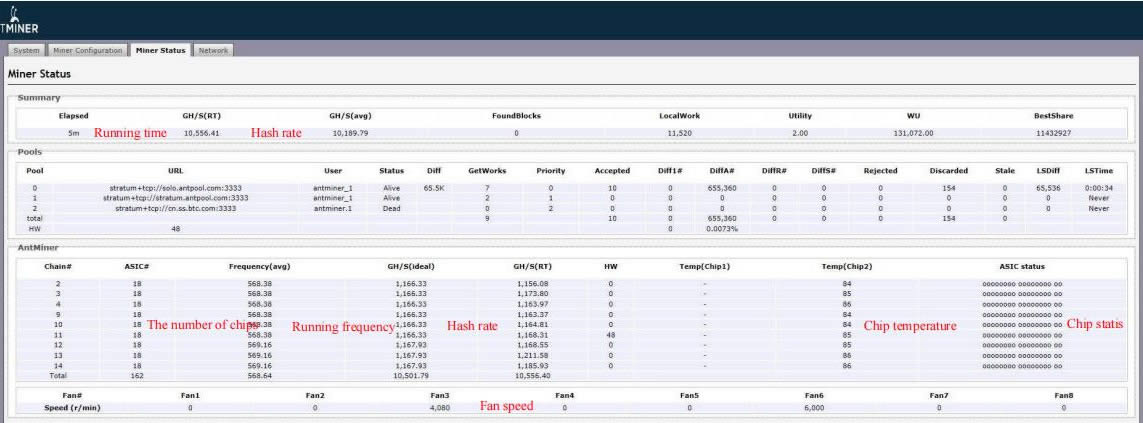 b. 9 and 10 belong to the first Hash board, 3, 11 and 12 belong to the second Hash board, and 4, 13 and 14 belong to the third Hash board. When which three boards belong to one Hash board can not easily determined, see the temperature behind. The three boards with same temperature belong to one Hash board. For most miners, the temperatures of the three Hash boards are different.