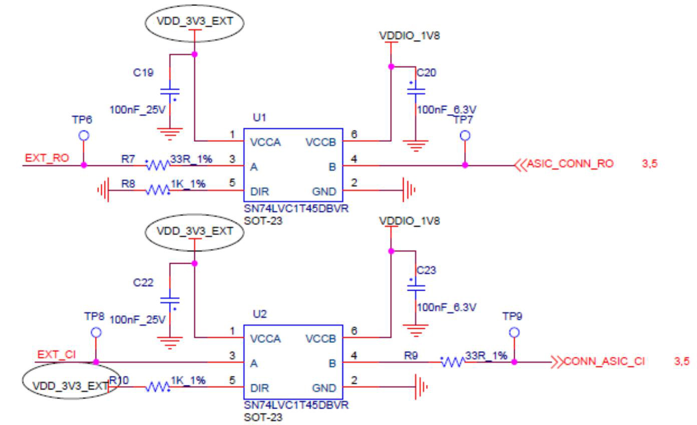 The TX (CI, CO) signal flows, from the IO port 7 pin (3.3V) into the level conversion IC U2, and then from the 01 chip to the 03 chip transmission; when the IO line is not inserted, the voltage is 0V, and the power supply during operation voltage 1.8V.