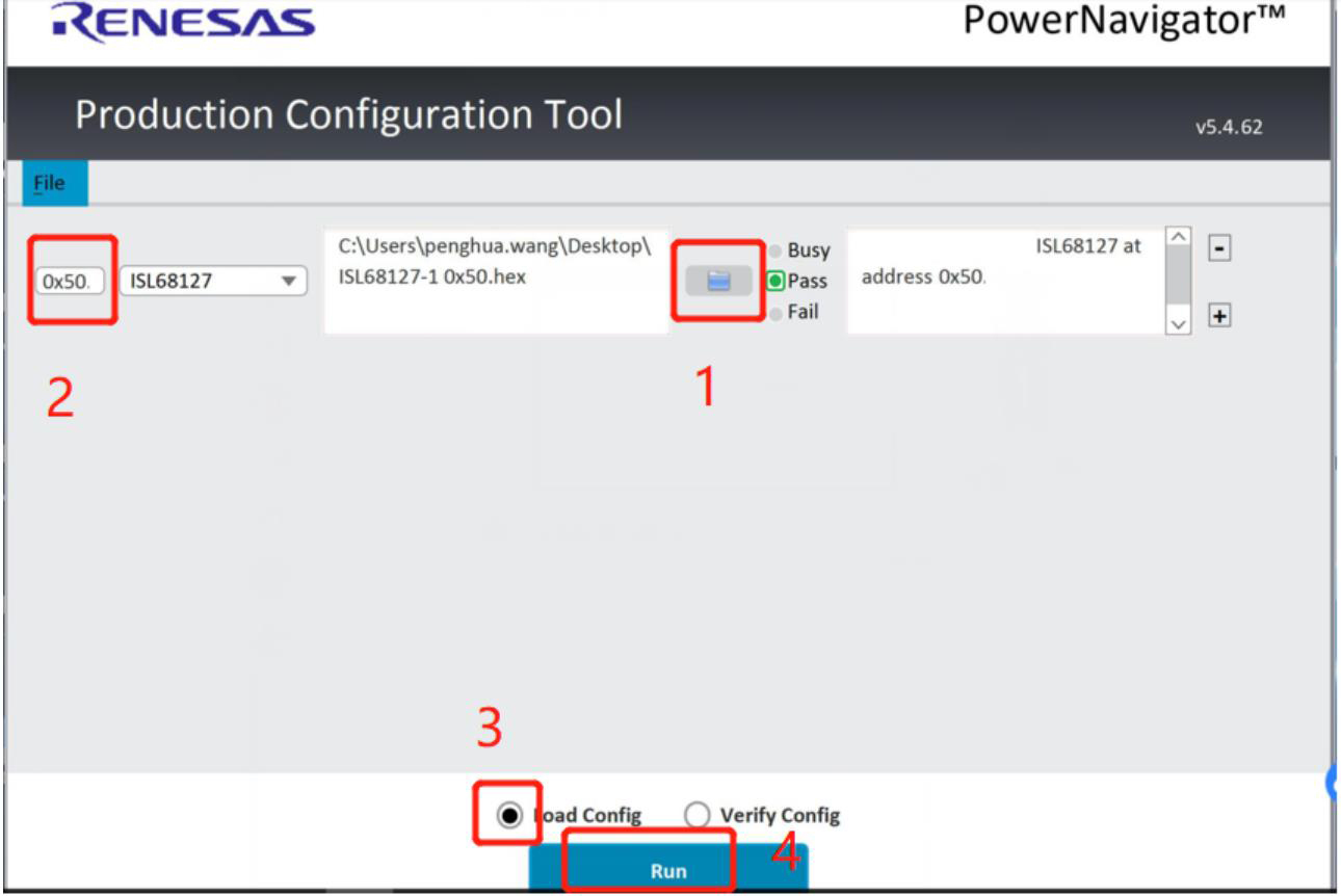 Run the Production Configuration Tool, click position 1 to select the latest firmware BEZ24601_V03.hex, and then change position 2 to 0x50 (set according to the corresponding chip address: