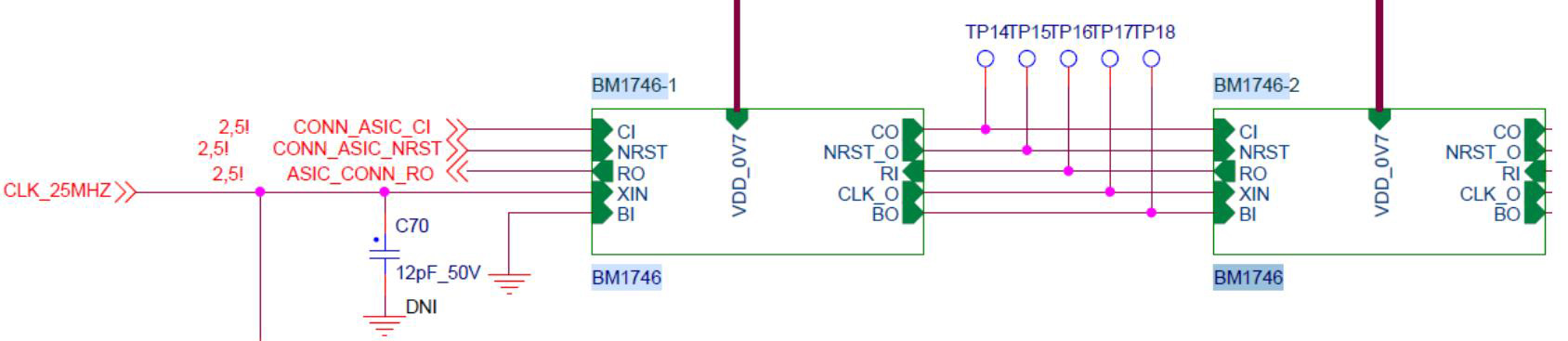 2. Signal direction of Z15 hash board:CLK (XIN) signal flow, generated by Y1 25M crystal oscillator, transmitted from chip 01 to chip 03; during operation, the voltage is 0.85V.