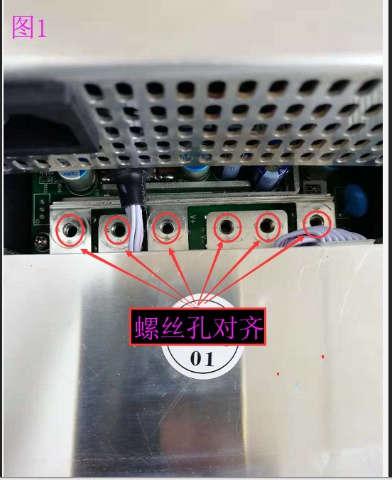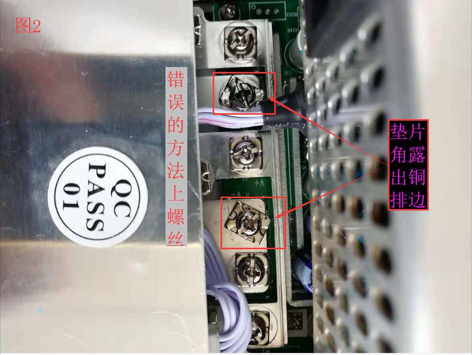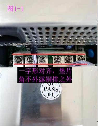The power supply is installed. (Note: The gaskets of the power terminal screws must be aligned in a straight line, and the corners of the gaskets must not be exposed outside the positive and negative copper bars. ) Correctly tighten the screws as shown in Figure 1 and Figure 1-1, wrong screw as shown in figure 2
