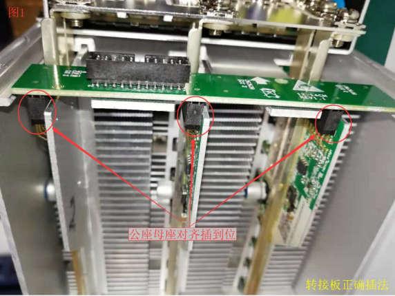 ①Remove the air inlet fan, and remove the fan baffle at the same time. ②Align the male socket of the hashrate board and insert the adapter board, Incorrectly inserted, and press it into place (as shown in Figure 1) method (Figure 2, Figure 3), ③Lock the 2 screws of the adapter board, ④Install the control board as described in ②③④⑤ of 1 .4 above to complete.
