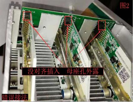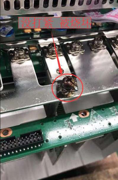 ①Insert the hash board along with the guide slot of the chassis and align the screw holes. ②Lock the copper row screws. The gaskets of the screws must be aligned in a straight line, and the corners of the gaskets must not be aligned exposed outside the positive and negative copper bars. ③The upper adapter board is the same as the point method of 1 .6 in ①②③, ④install the air inlet fan, ⑤install the control board the same as 1 .4 ②③④⑤ Click the method to complete. (Note: The screws must be tightened, otherwise the phenomenon of sparking and burning will occur, as shown in the figure below).