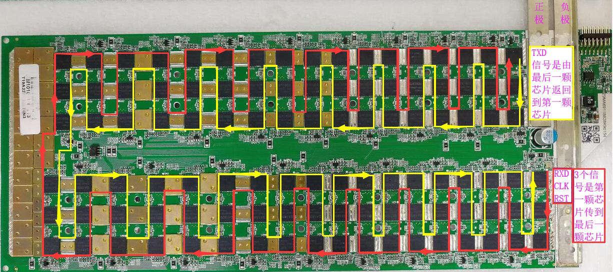 M10 is composed of 35 layers in series, each layer has 3 1800 chips in parallel, and the whole board has a total of 105 chips. Each layer of voltage domain has an independent LDO that provides 1.8v and 0.9v voltages and is composed of RST, CTS, RXD, TXD, and CLK. M10 has only 1 24M clock and 1 temperature sensor, plus 1 EEPROM is the whole board signal composition. Signal flow direction: CLK, RXD, RST are all transmitted from the first chip to the last chip, and TXD is returned from the last chip to the first chip.