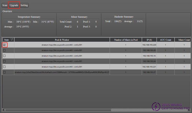 • Select the miner that needs to be updated in the fms main window and click "Upgrade" in the above picture. On this page, we can upgrade the firmware for it. For detailed tutorials, please click here to view.