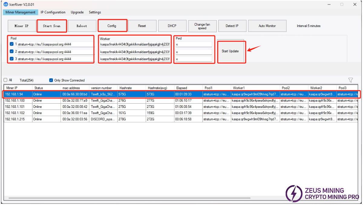 4. To find the IceRiver ASIC, we select the IP range to be scanned and click the "Start Scan" button. After finding the ASIC, click the Config button, select the required ASIC, enter the mining pool address in the Pool line, input the wallet number in the Worker line, write the password in the Pwd line, and then click "Start Update".