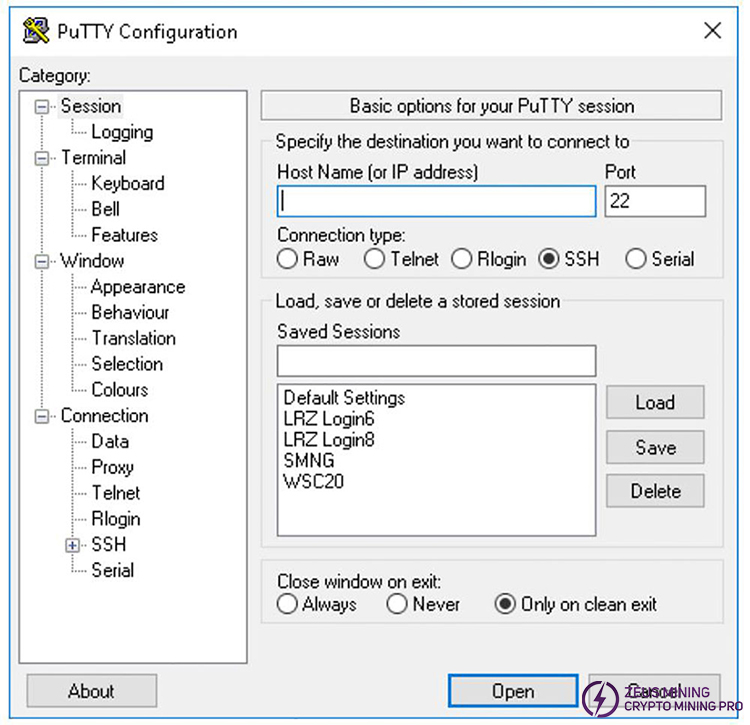 5. After installation, launch the PuTTY program. We will see the following window. Enter the IP address of our Antminer miner in the "Host Name (or IP address)" field. The "Port" field should remain set to 22 by default. Select SSH and click the "Open" button to connect to the miner.