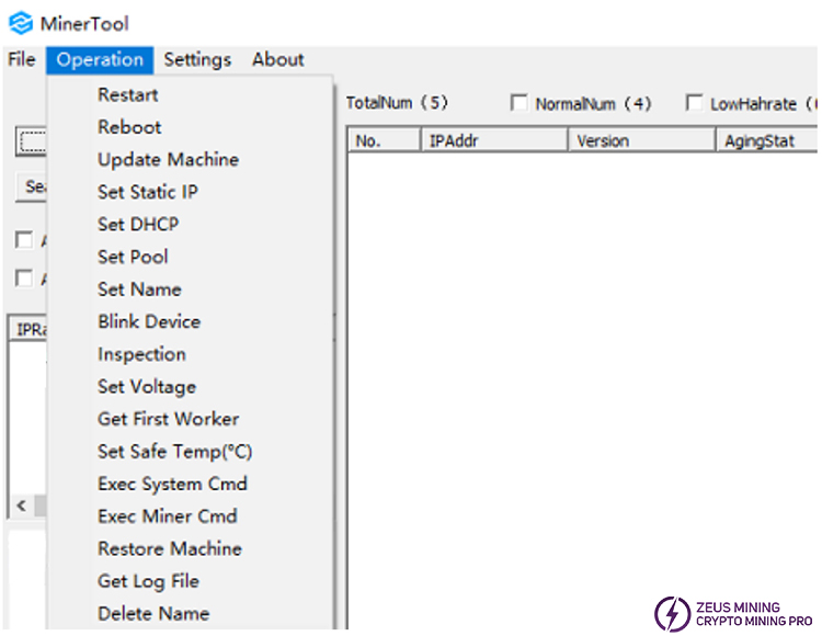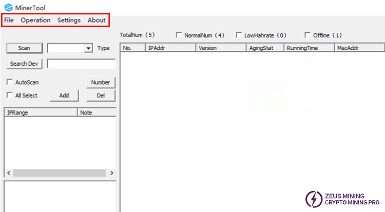 • Among them, "File" includes importing lists, exporting lists, and exiting; "Operation" includes various major operations on the miners; "Settings" is mainly for making some parameter adjustments when miners need to be upgraded, facilitating maintenance personnel to maintain and inspect problematic miners, then checking the box "For English Version" allows for switching between Chinese and English. "About" contains some help options.