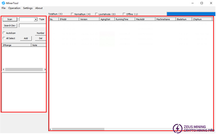 • On the left side are the relevant operations for scanning IPs. The basic information such as miner IP addresses and versions will be displayed in the display box on the right side.