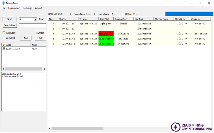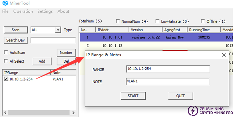 3. After the miners are powered on, connected to the network, and running normally, open the software to add the network segment where the device is located, and scan the IP automatically or manually to complete the search for miners.