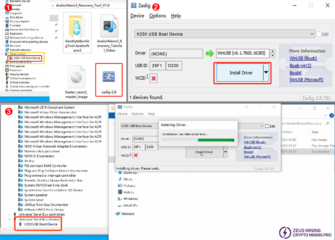 3.Double-click the Zadig-2.8 program to install the driver for the K230 USB boot device. Confirm that the device is K230 USB boot device, then click the "Install Driver" button. When the warning sign for the K230 USB boot device disappears, it indicates that the drivers for the Avalon Nano 3 have been successfully installed.