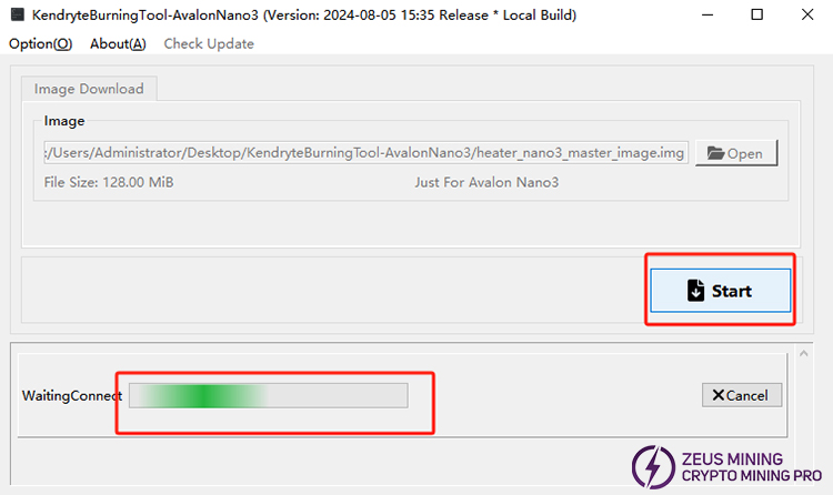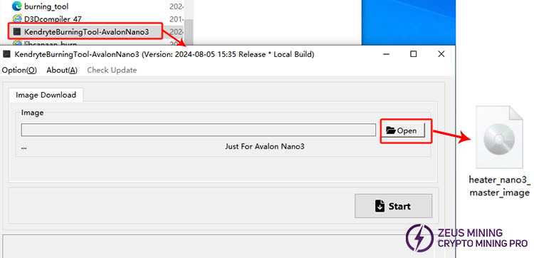 4.Run KendryteBurningTool-AvalonNano3, click the "Open" button, and select the image file "heater_nano3_master_image.img". Then, click the "Start" button to begin automatically recovering the Avalon Nano 3. When the "Download Complete" message appears, the image for the Avalon Nano 3 has been successfully recovered.