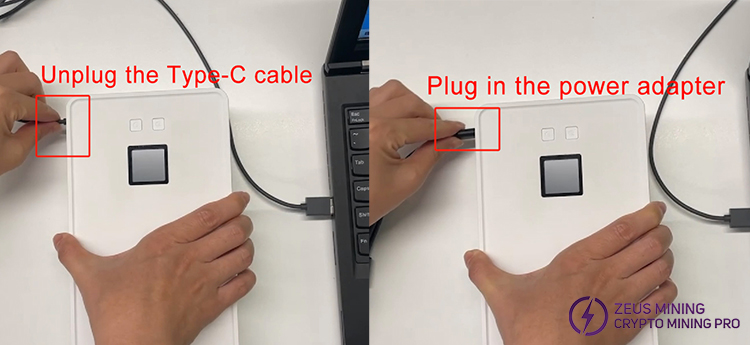 5.Connect the Avalon Nano3 to the power adapter. Disconnect the Type-C cable and then connect the Avalon Nano 3 to the power adapter.