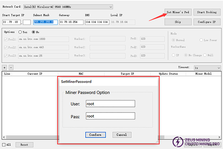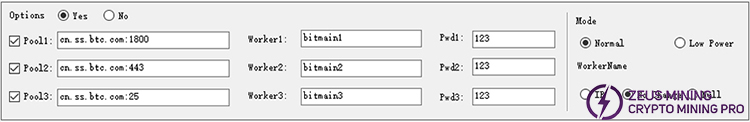 3. Set the mining pool address, account number and password. If this information is not set, the software will only set the IP address and not other information.