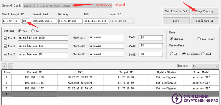 4. Set the "Startup target IP". It will automatically fill in the target address of the miner. Select the network card on the same local area network as the miner, click "Start Probing", then press the IP REPORT button on the miner to obtain and import the IP and MAC addresses into the software. If the button does not respond, we can click "Skip" to skip the miner, users can add, delete, modify and query the form as needed.