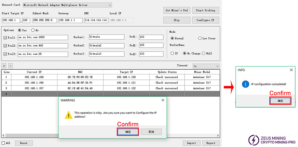 5. After all the miners have been set up in the software, click "Configure IP". The software will search for miners with IP conflicts, mark them in red and prompt for modification. If there are no conflicts, it will ask whether to continue with the setup. Click "Confirm" and the software will send the command to modify the IP to the miners. If successful, a success message will be displayed; otherwise, a failure message will be shown. This program can also import files exported in csv format by Btctools, and we can operate according to our needs.