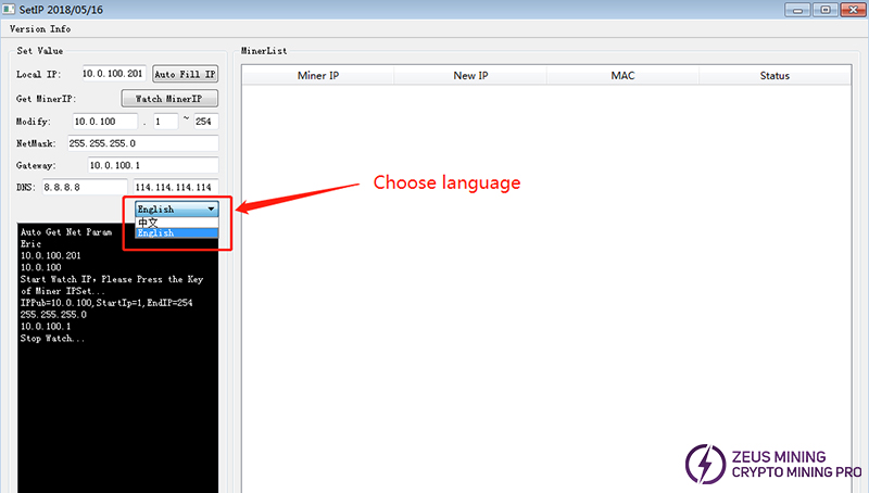 3. Place this tool on a computer connected to the same router as the miner. We can click to switch between Chinese and English.