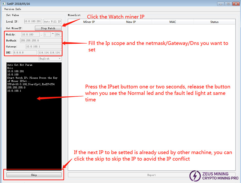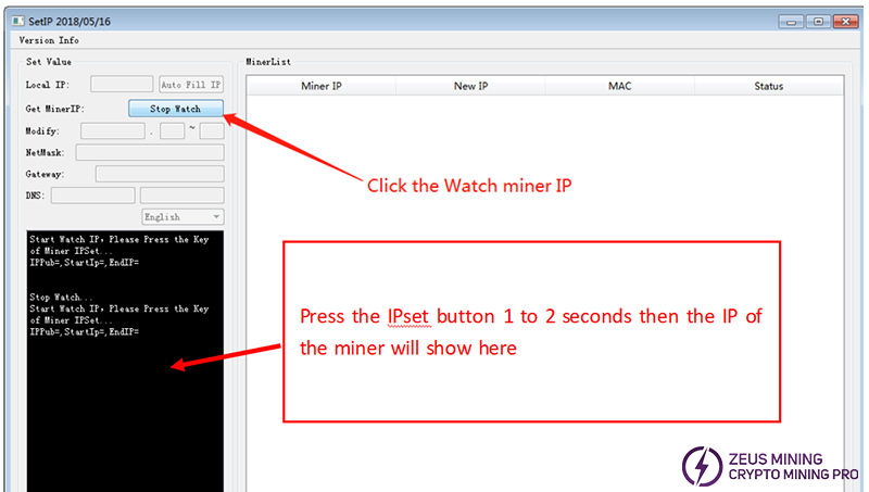 4. Click "Watch MinerIP", and then press and hold the miner's IPset button for 1 to 2 seconds. The IP will be displayed below.